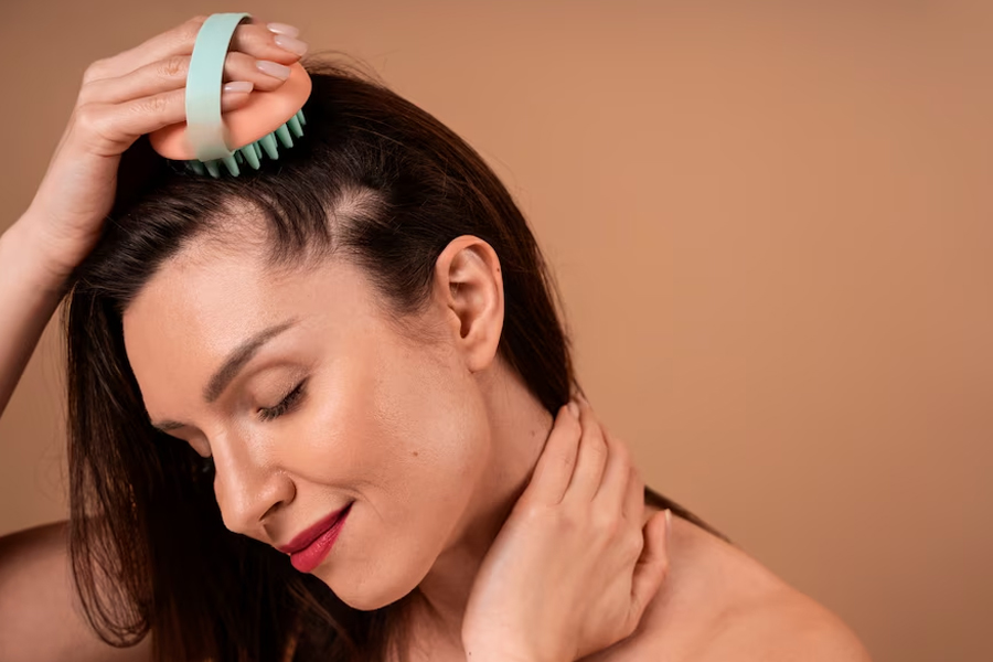 Step 5: Use a scalp massager to help increase blood circulation, distribute oils, and ensure that detox products penetrate the scalp effectively.