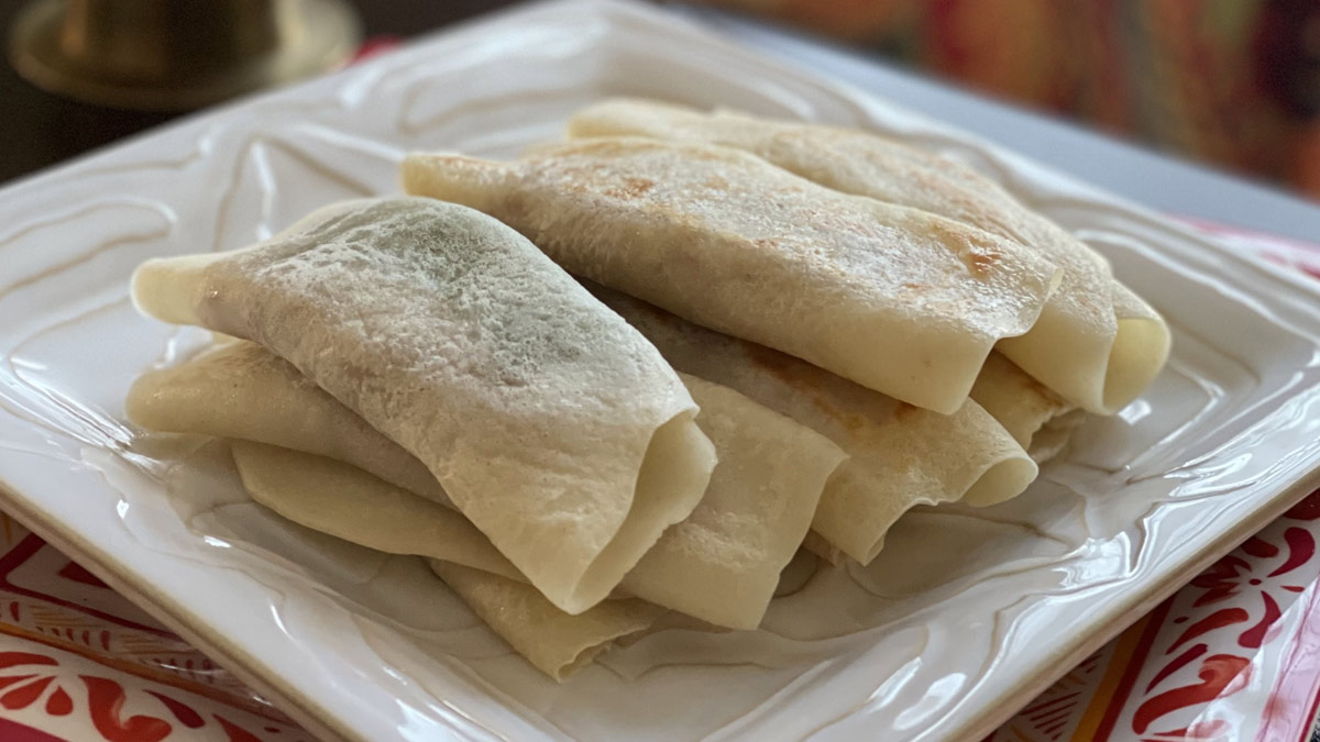 Patishapta is a traditional Bengali dessert, which is essentially a sweet rice crepe. The filling is made by cooking jaggery with grated coconut, and sometimes khoya (reduced milk) and cardamom. The crepes are rolled up and served with a drizzle of jaggery syrup.